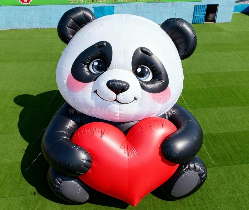 Transform your event space with this adorable Cartoon3-144 Panda Heart Inflatable Model Product from Chinee Inflatables Inc. This charming inflatable features a loveable giant panda with big expressive eyes and rosy cheeks, tenderly holding a bright red heart that symbolizes love and affection.