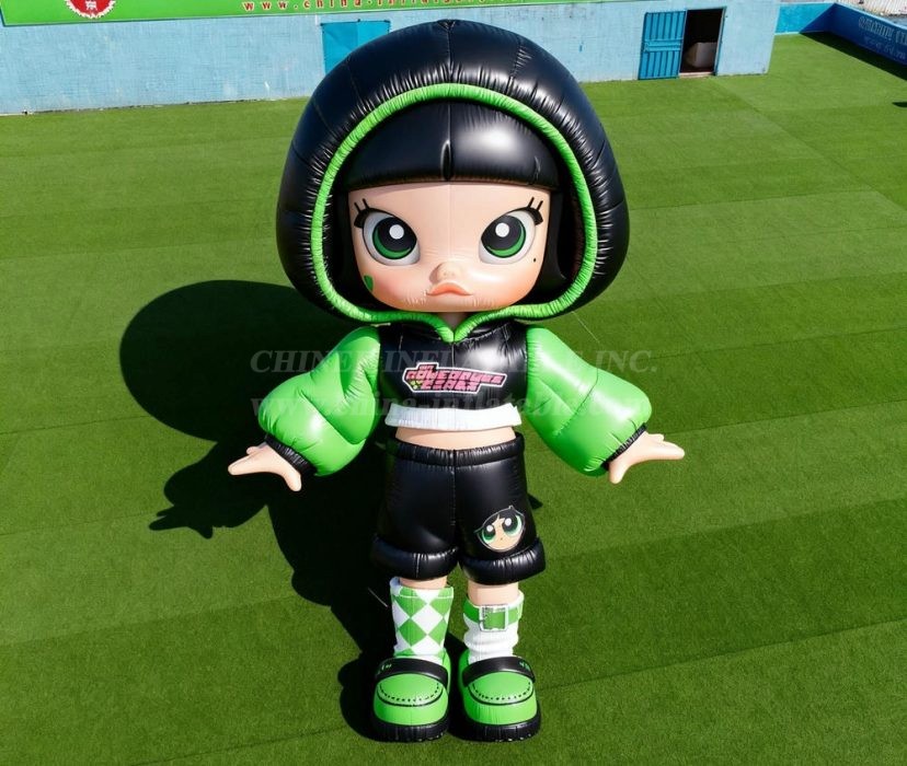 Crafted with meticulous attention to detail, this impressive inflatable showcases a charming character with large expressive green eyes, rosy cheeks, and a friendly demeanor that appeals to audiences of all ages. The character sports a trendy green and black outfit complete with decorative elements and stylish footwear, making it perfect for modern events and promotional activities.