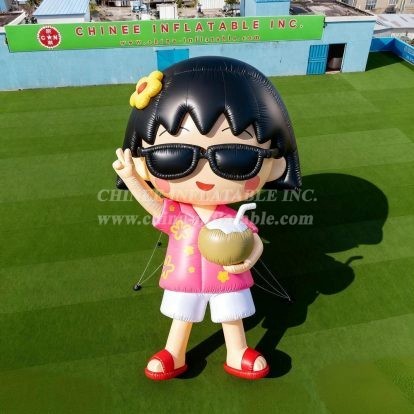 Bring tropical vibes to your next event with this charming Cartoon3-205 Summer Girl with Sunglasses inflatable cartoon! This delightful decorative inflatable features an adorable cartoon girl character complete with stylish black sunglasses, flowing black hair with a cute yellow hair accessory, and a beautiful pink floral Hawaiian-style top paired with crisp white shorts and red sandals.