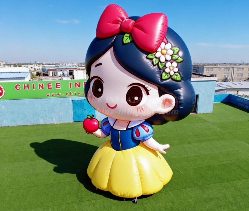 Bring the magic of fairy tales to life with this enchanting Snow White-inspired inflatable cartoon character from Chinee Inflatables Inc. This oversized inflatable figure captures the beloved princess in adorable cartoon style, complete with her iconic blue and yellow dress, flowing black hair adorned with a bright red bow, and delicate white flowers. Standing proudly with a shiny red apple in hand, this charming inflatable creates an instant focal point that delights children and adults alike.
