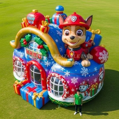 Bring heroic holiday fun to your next event with the Cartoon3-606 PAW Patrol Inflatable Bouncer. This cheerful bounce house features a playful pup in a firefighter outfit, festive gift boxes, and snowflake graphics across a cozy house facade—instantly creating a bright, welcoming centerpiece for parks, school fairs, and rental parties. Kids enter through the soft step at the front and enjoy a spacious, fully enclosed bouncing area with clear-mesh windows for great visibility and airflow.