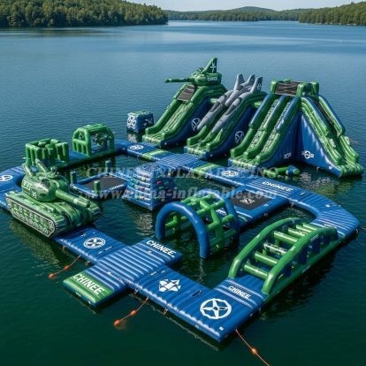 Command attention on the water with the S289 Military Style Water Park from Chinee Inflatables. This large-scale floating adventure course blends eye‑catching camouflage graphics with action‑packed features including dual high slides modeled with jet and rocket elements, climbable towers, balance beams, tunnels, and hop pads that link into a complete circuit. Participants can sprint, crawl, climb, and splash their way across the layout, or launch into the water from the slide towers for maximum thrills.