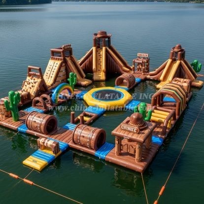 Bring a bold frontier adventure to your waterfront with the S336 Western Theme Water Park by Chinee Inflatables Inc. This floating attraction blends towering slides, climbing walls, tunnels, balance beams, and a central jump zone into a vibrant Wild West layout—complete with rustic wood textures, cactus accents, and playful rainbow arches. Designed for lakes, reservoirs, and calm seaside bays, the S336 delivers an exciting circuit that keeps guests moving, competing, and laughing from start to finish.