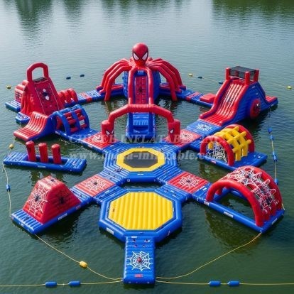 Bring blockbuster excitement to the water with the S354 Spider-Man Theme Water Park by Chinee Inflatables. This eye‑catching floating course features bold red, blue, and yellow panels with web graphics, sculpted character elements, and multiple action zones connected by stable walkways. Guests can climb the central tower, dash across balance pads, crawl through web arches, and conquer slide sections before splashing back into the water. Designed for high throughput and nonstop fun, the layout encourages circuit-style play for kids, teens, and adventurous adults.