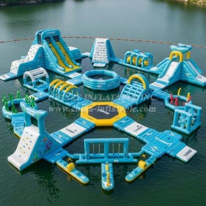 Make a splash with the S383 Ocean Theme Inflatable Water Park by Chinee Inflatables. Designed for lakes, reservoirs, and calm coastal waters, this modular floating course blends thrilling obstacles with eye‑catching ocean graphics to create an unforgettable waterfront attraction. Guests can climb, slide, balance, and jump their way across multiple challenge elements, including tall dual slides, climbing walls, arched crawls, balance beams, a central jump pad, and splash-safe transfer bridges. The layout promotes continuous circulation, helping operators manage traffic while maximizing play time and throughput.