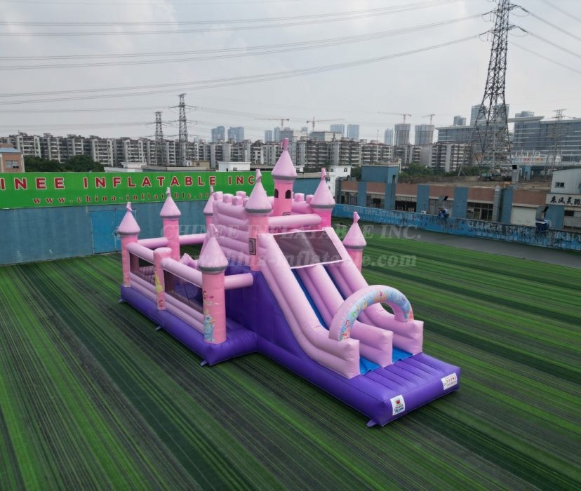 Straight from the Chinee Inflatables factory, this enchanting pink and purple palace is designed to be the crown jewel of any party or event. With its towering turrets, royal flags, and a beautiful archway adorned with classic princesses, this inflatable is an absolute showstopper.
