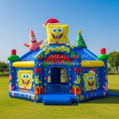 Bring undersea fun to your next event with the T2-8640 SpongeBob Inflatable Bouncer from Chinee Inflatables Inc. This cheerful bounce house features bright, full‑color graphics of SpongeBob and friends, plus festive holiday accents like a Santa hat and a decorated Christmas tree on the roof. The spacious jumping area invites kids to bounce, laugh, and burn energy while vivid panels and playful details create an immersive atmosphere that stands out on any field, backyard, or school yard.