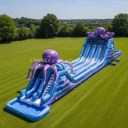 Dive into thrilling aquatic fun with the T8-8995 Octopus Inflatable Water Slide! Featuring a striking purple octopus design and vibrant ocean-themed details, this massive slide delivers non-stop excitement for all ages. Perfect for outdoor events or water parks, its long sliding lanes and splash pool ensure hours of safe, refreshing play. Built with Chinee Inflatables’ renowned durability and craftsmanship, it’s the ultimate centerpiece for any summer adventure.