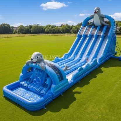 Make a splash with the T8-9009 Dolphin Inflatable Water Slide by Chinee Inflatables! Featuring adorable dolphin designs and a thrilling multi-lane descent, this ocean-themed slide delivers endless excitement for outdoor events. Built from durable, high-quality materials, it ensures safe, smooth rides and hours of fun in the sun. Perfect for parks, schools, and summer parties, it's a standout attraction that will keep kids and adults entertained all day.