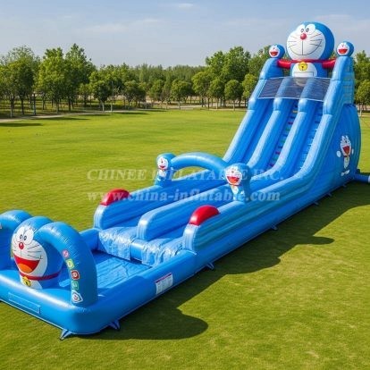 Bright Doraemon-themed inflatable water slide perfect for rentals, parks, and backyard fun. Two soaring lanes, secure high side walls, climbing ladder and splash pool deliver thrilling yet safe rides. Made from heavy-duty, UV-resistant PVC with reinforced seams and easy anchoring. Eye-catching character graphics attract kids and families — ideal for events, summer camps, and party entertainment. Factory-direct from Chinee Inflatables.